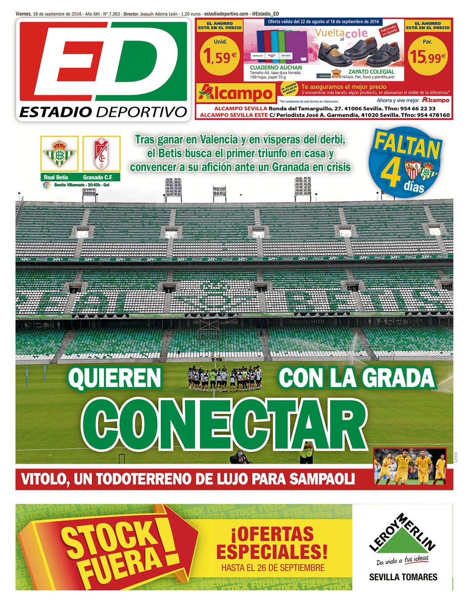 El " Estadio Deportivo " abre con el titular: "Quieren conectar con la grada", Tras ganar en Valencia y en vísperas del derbi, el Betis busca el primer triunfo en casa y convencer a su afición ante un Granada en crisis. Faltan 4 días para medirse el Sevilla contra el Betis en el Sánchez Pizjuan, por lo que todo apunta a que puede haber rotaciones o no, todo apurando hasta el último día. El Betis necesita de los 3 puntos - empató 2-2 contra el Granada -.